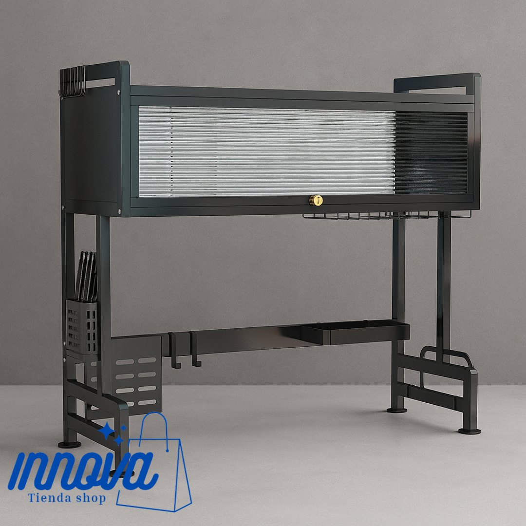 La platera con vitrina para doble pozo está diseñada para ofrecer orden, practicidad y elegancia en tu cocina. Su estructura moderna permite aprovechar al máximo el espacio sobre el lavaplatos de doble pozo, manteniendo tus utensilios perfectamente organizados y secos sin ocupar la encimera.